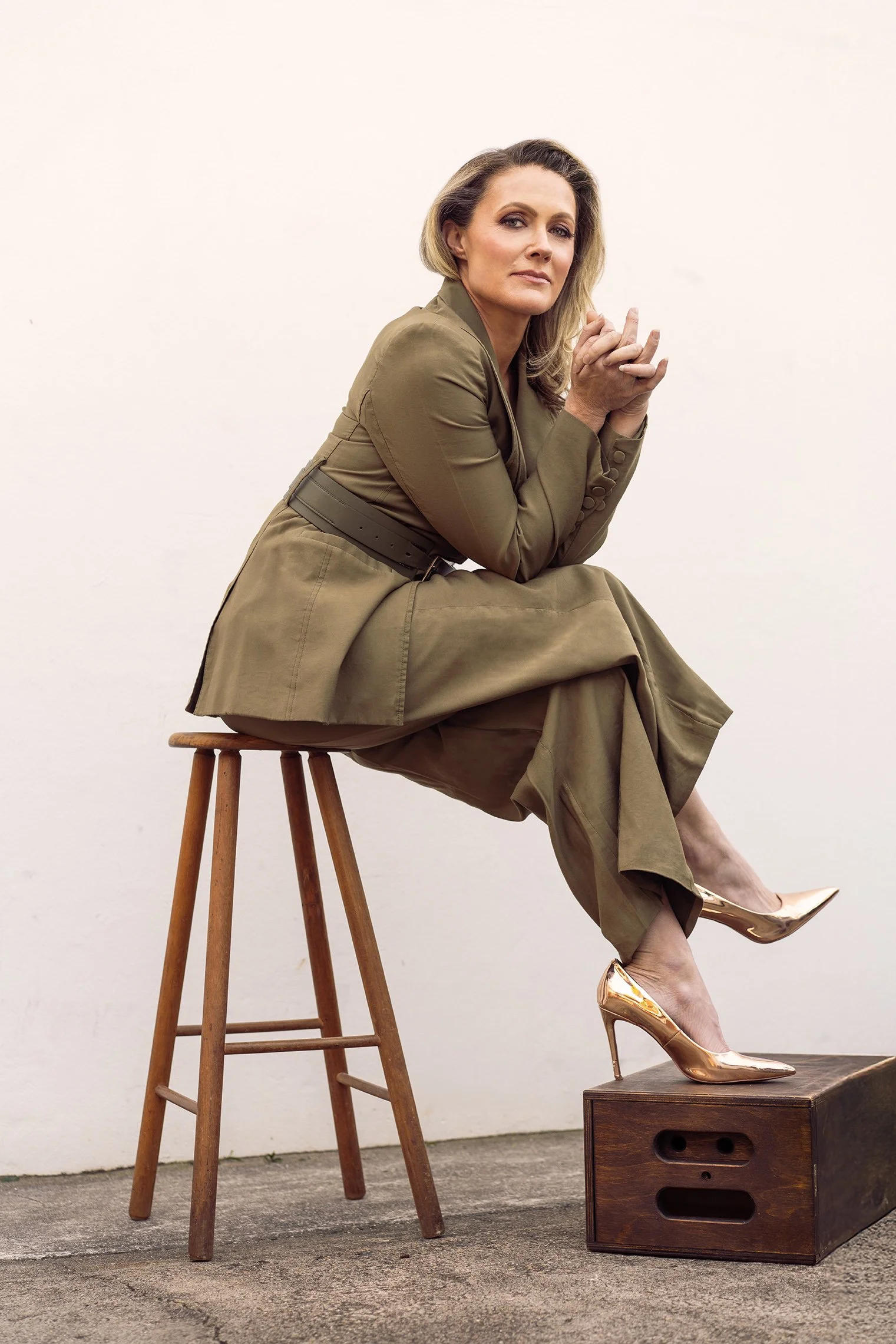 A woman dressed in a tan trench coat and matching wide-leg pants, sitting on a wooden stool, with one foot on a wooden box. She is wearing shiny gold high heels and has blonde hair styled in loose waves. Actor Headshot Marney McQueen.