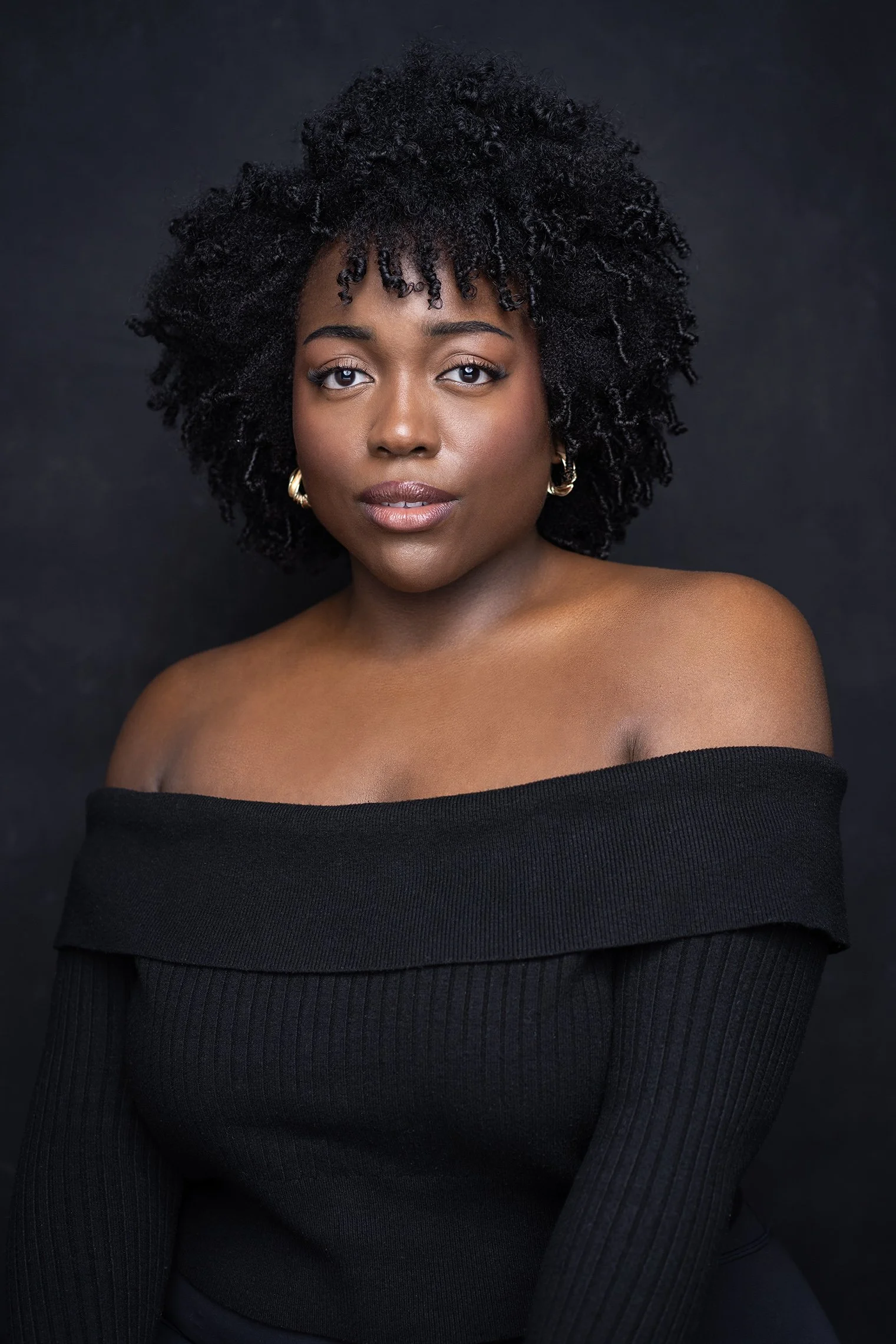 A portrait of a confident young woman with natural curly black hair, wearing an off-the-shoulder black top and gold hoop earrings, against a dark background. Actor Headshot Gabriyel Thomas.