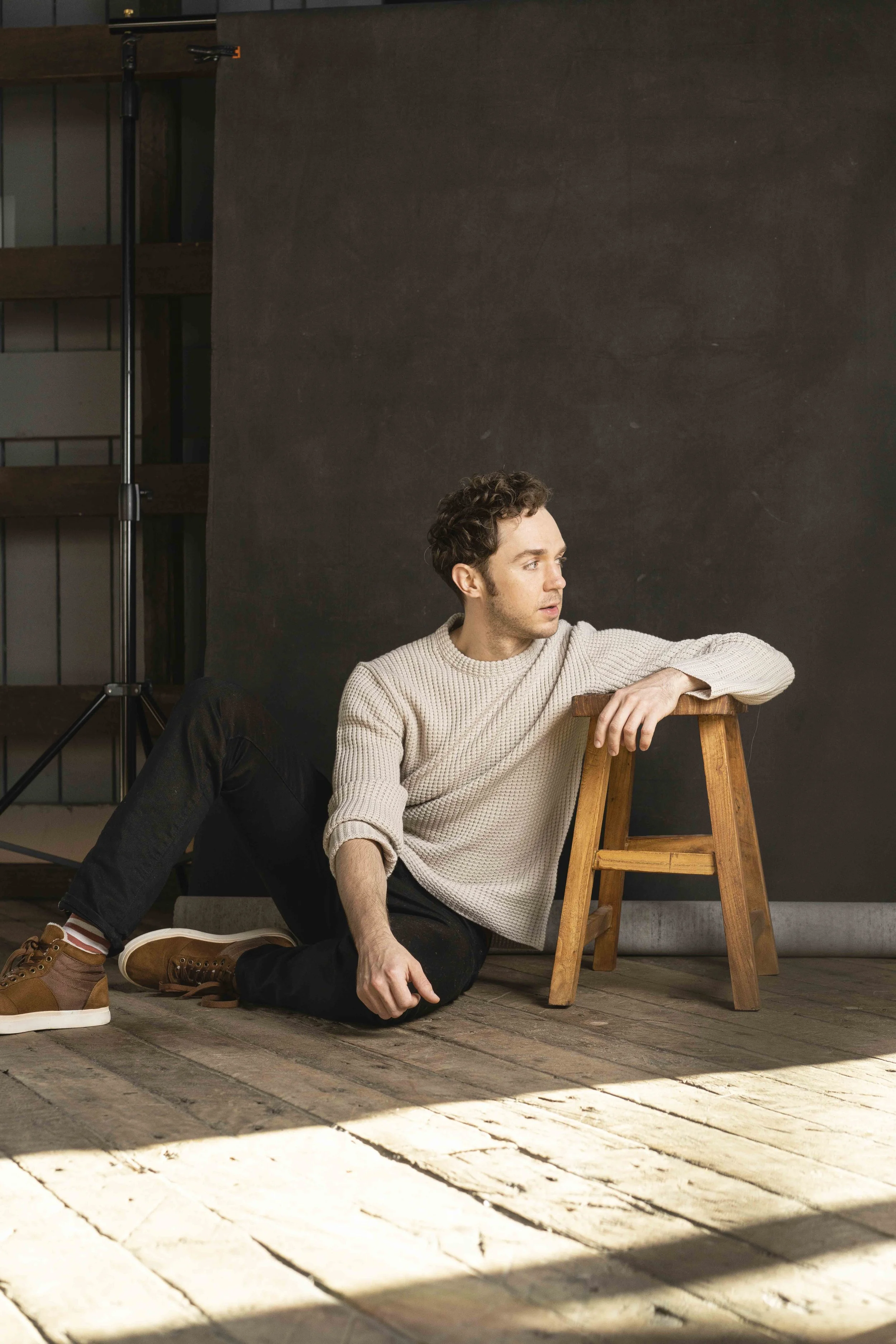 A young man with curly hair and light skin sitting on a wooden floor, leaning on a small wooden stool, looking to his right. He is wearing a beige knitted sweater, black pants, and brown sneakers with striped socks. Actor Headshot Rowan Witt.