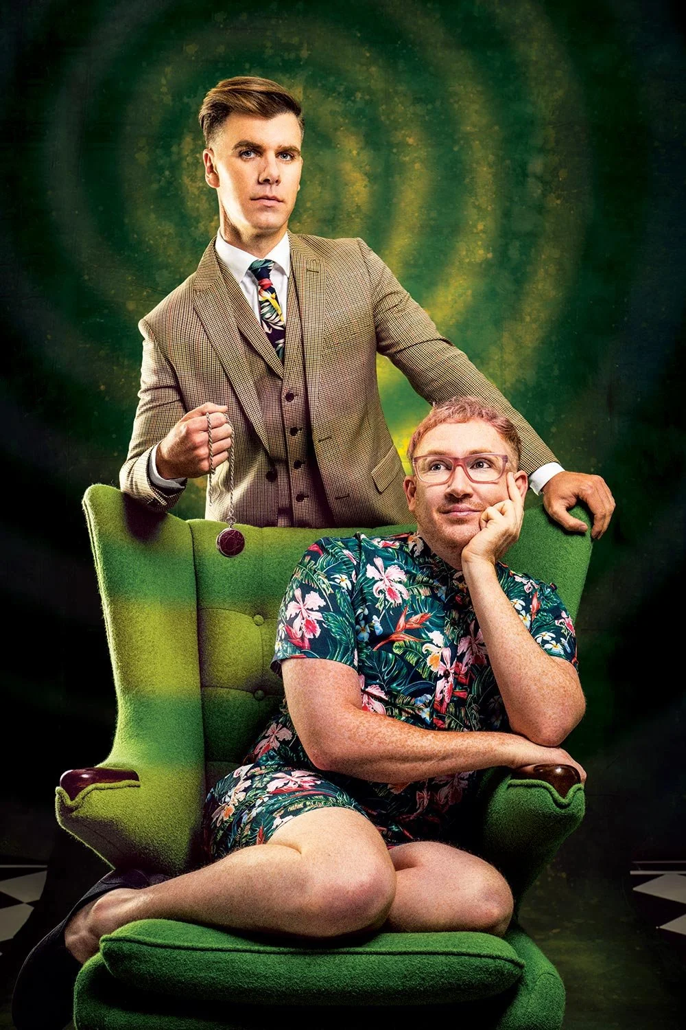 Two men. The man standing is wearing a beige checked suit, a colorful tie, and holding a pocket watch. The man sitting is wearing glasses and a colorful tropical shirt, sitting cross-legged in a green armchair, resting his head on his hand. The backg