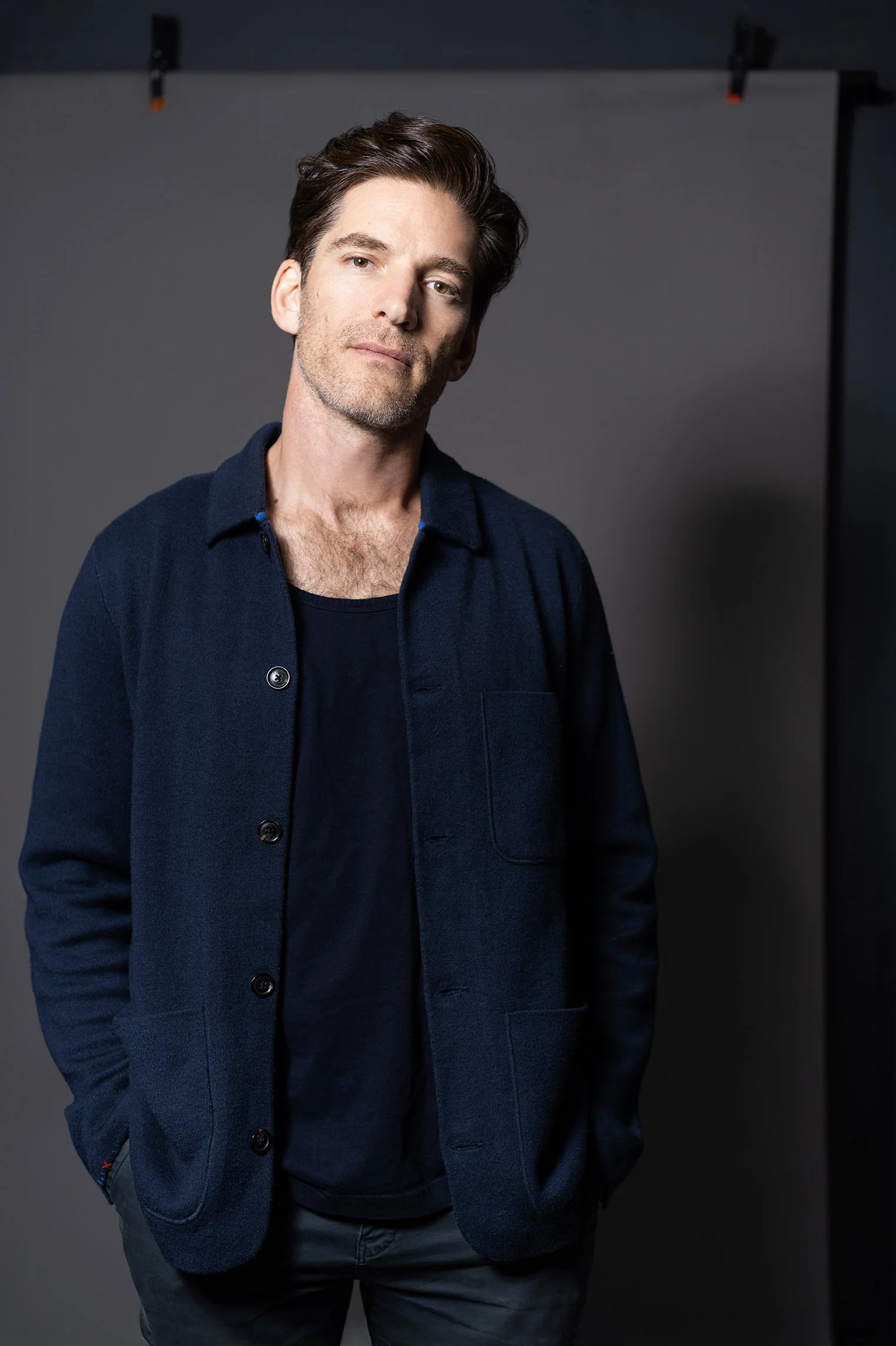 A man with light skin, dark hair, and a slight beard, standing in front of a gray background with a serious expression, wearing a dark blue blazer over a black shirt. Actor Headshot Andrew Cutcliffe.