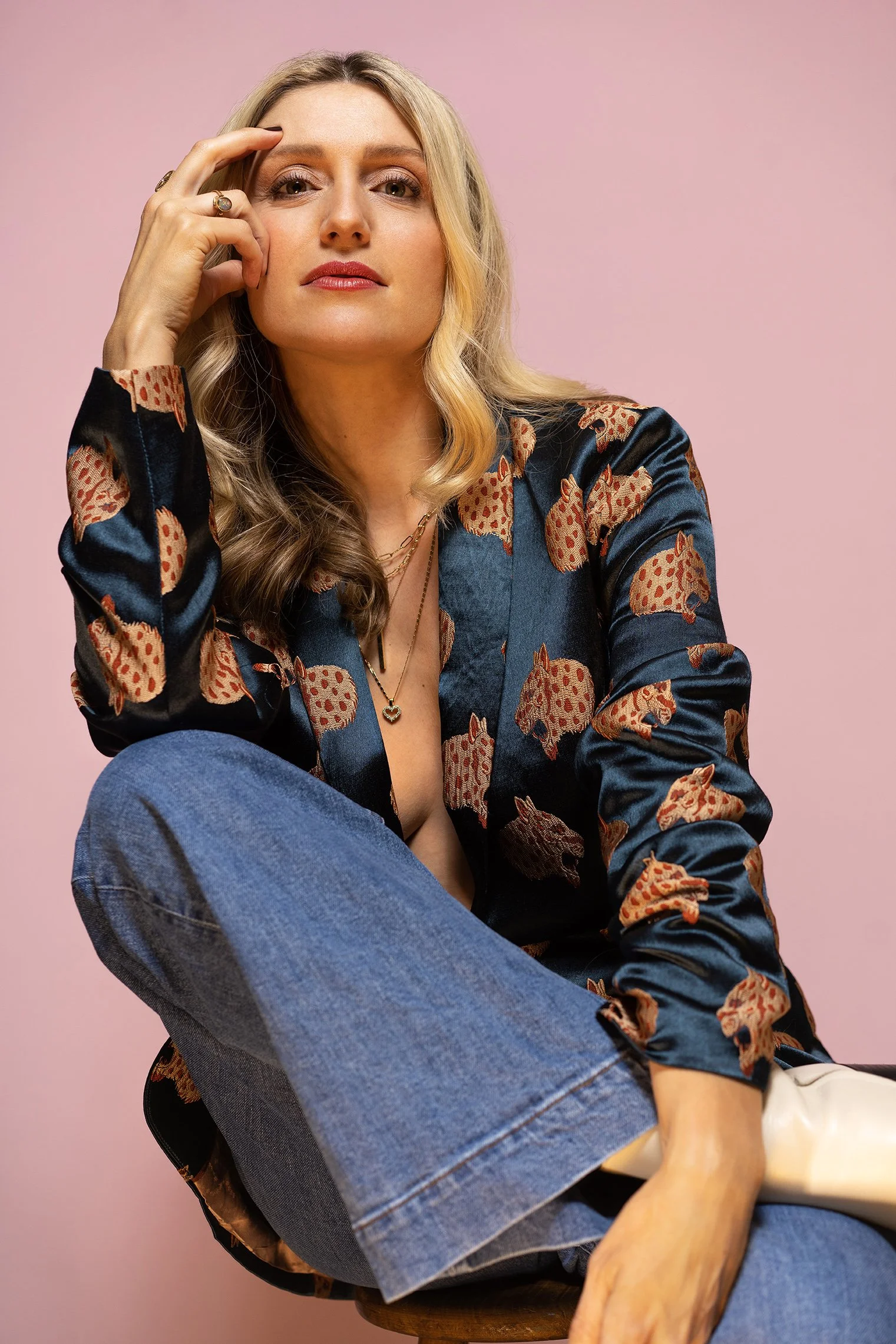 A woman with blonde hair wearing a black silk jacket with a horse and polka dot pattern, blue jeans, and jewelry, sitting against a pink background. Actor Headshot Hayley McCarthy.