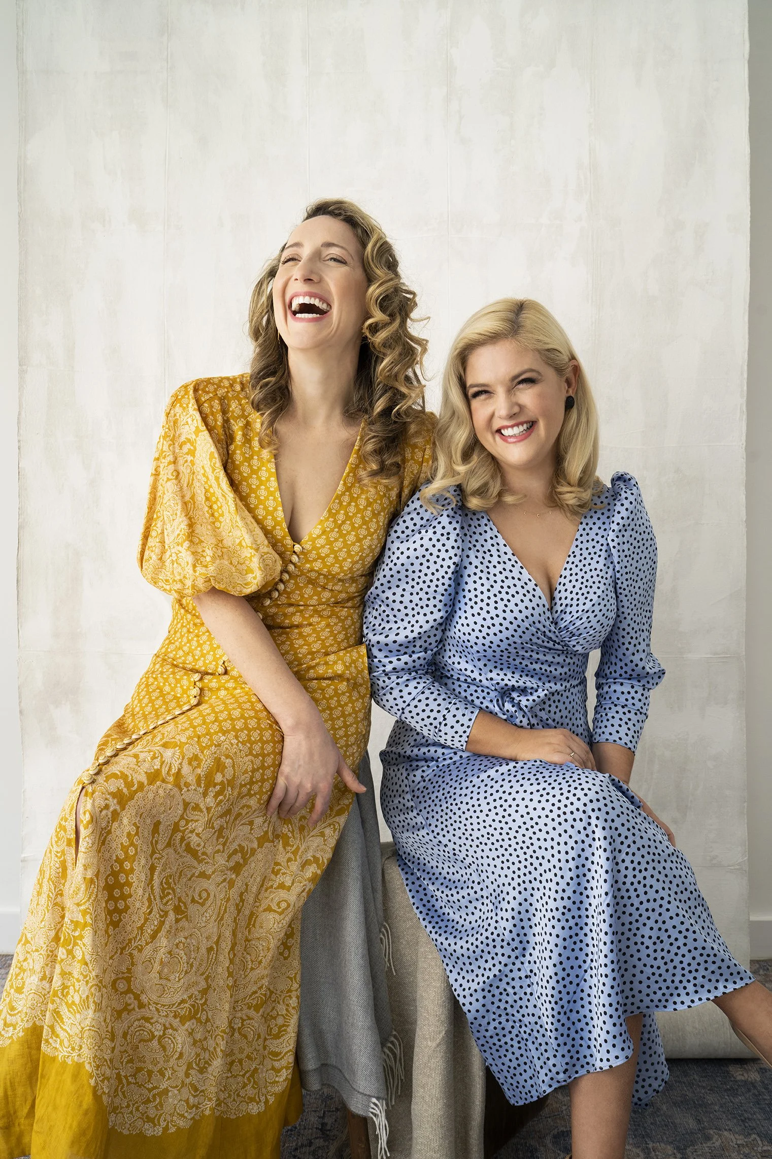 Two women smiling and laughing, dressed in colorful dresses, sitting against a white wall. Actor Elise McCann and Lucy Durack, owners of Hey Lemonade.