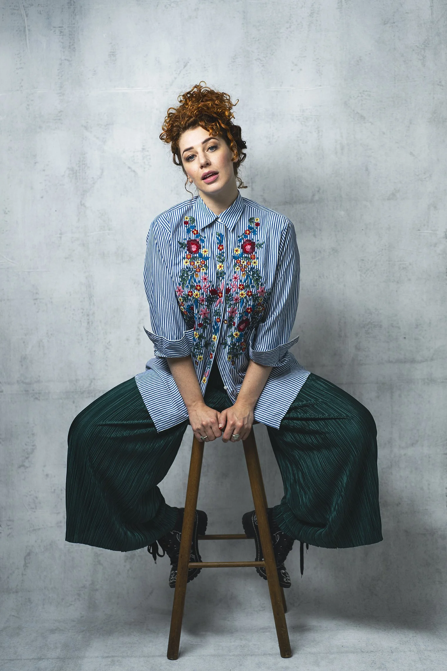 A woman with curly red hair sitting on a wooden stool against a plain wall. She is wearing a blue and white striped shirt with colorful floral embroidery on the front and dark green pleated wide-leg pants. Actor Headshot Madeline Mackenzie.